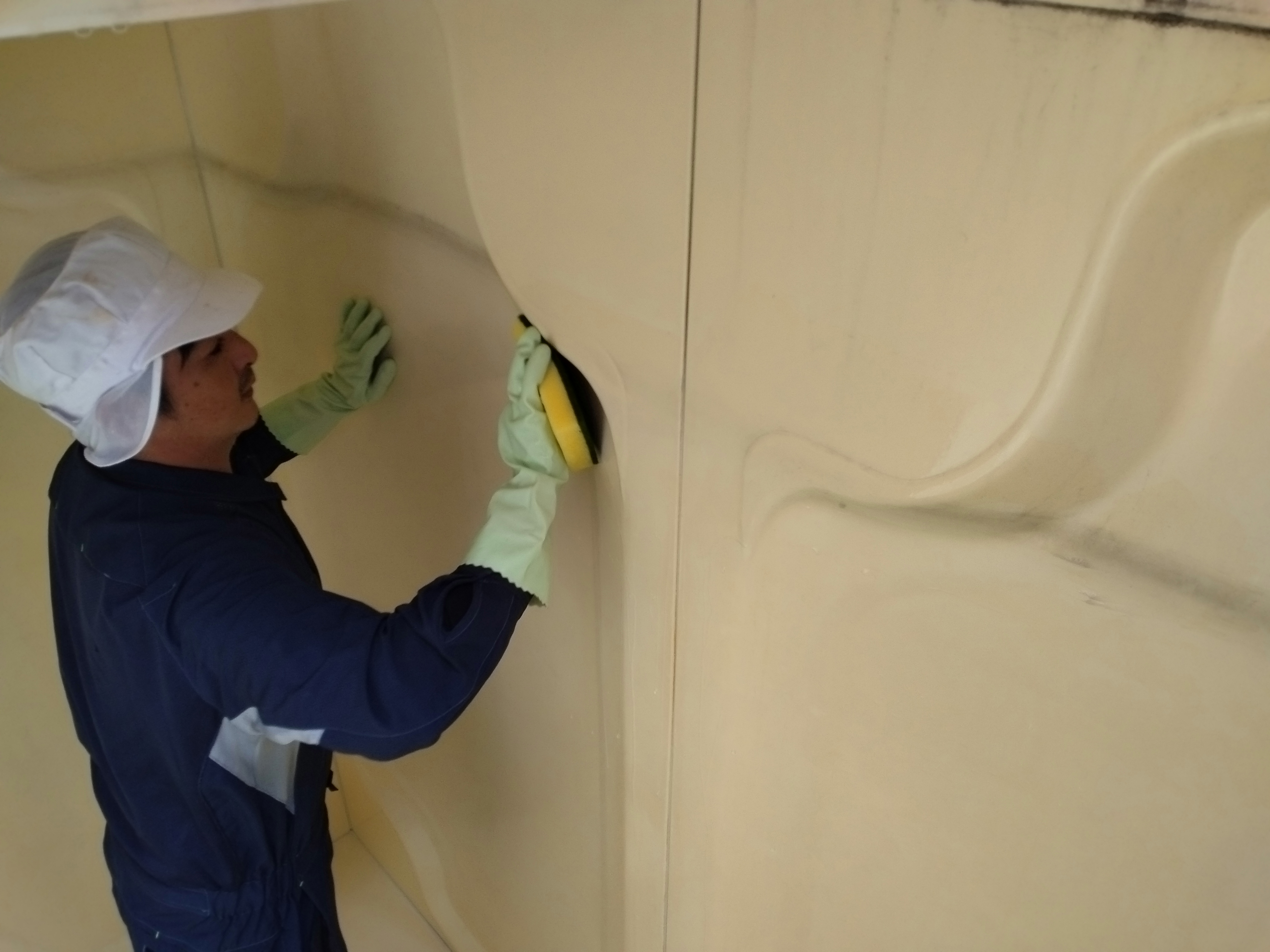 専用の薬剤を溶かした水を使い、スポンジを使って磨いていきます。